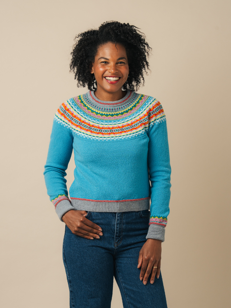 A modern interpretation of the Scottish Fairisle yoke pattern, this design features a subtle rib hem around the hip for a contemporary touch. Above the elongated rib cuffs, small pattern detailing mimics a bracelet, adding a unique flair.