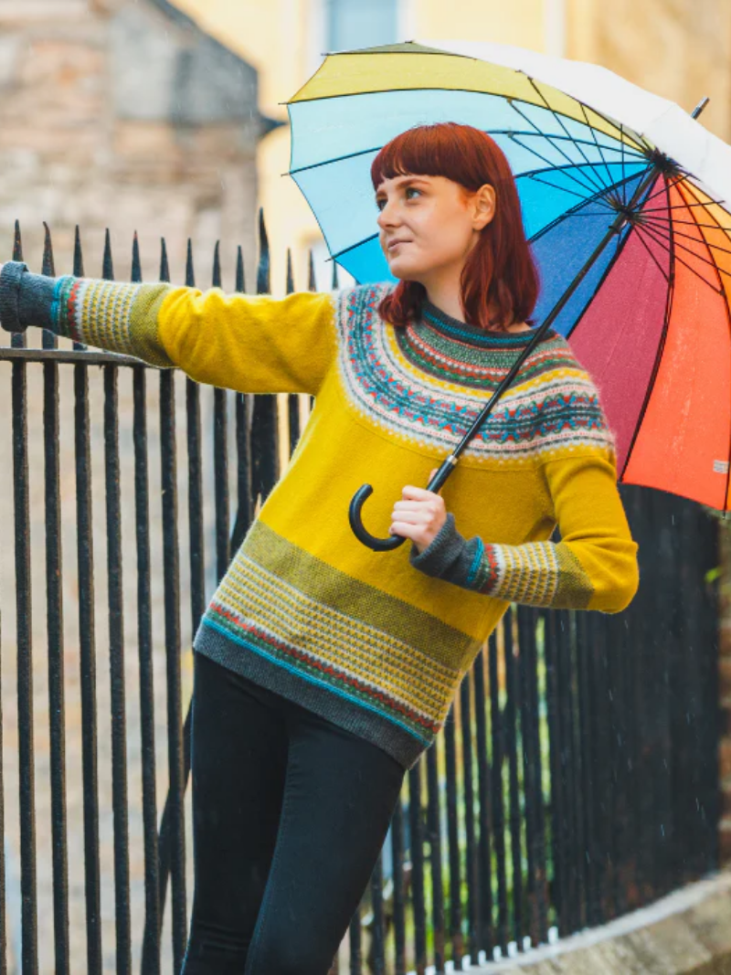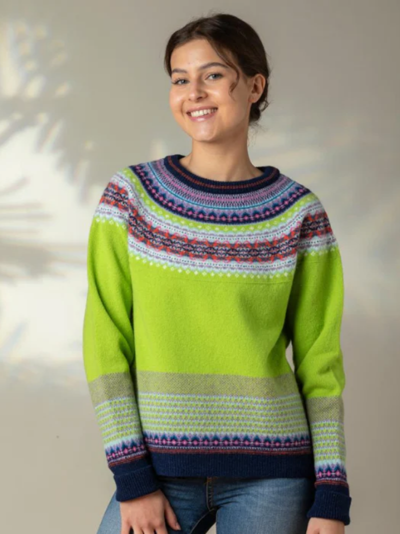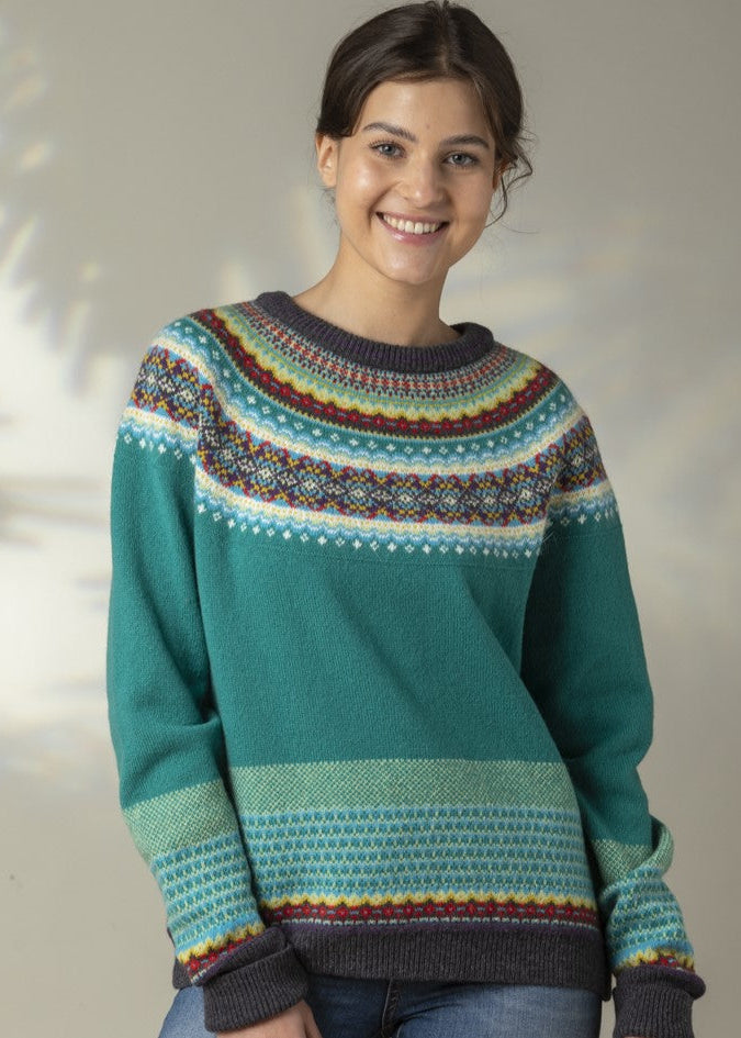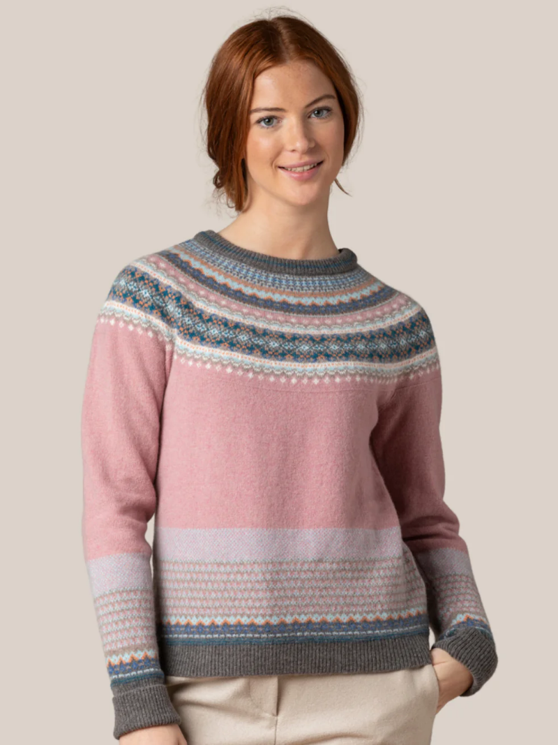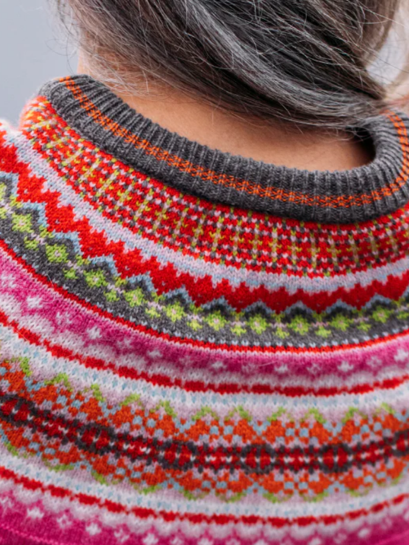 This ERIBÉ classic design is a contemporary twist on the Scottish Fairisle yoke pattern, enhanced with tweed detailing around the rib hems. Our carefully crafted colours, a months-long process, offer a vibrant selection, with new colourways introduced each year. The extra-long cuffs provide added warmth or accommodate longer arms. Explore timeless style with ERIBÉ, where classic patterns meet modern design.